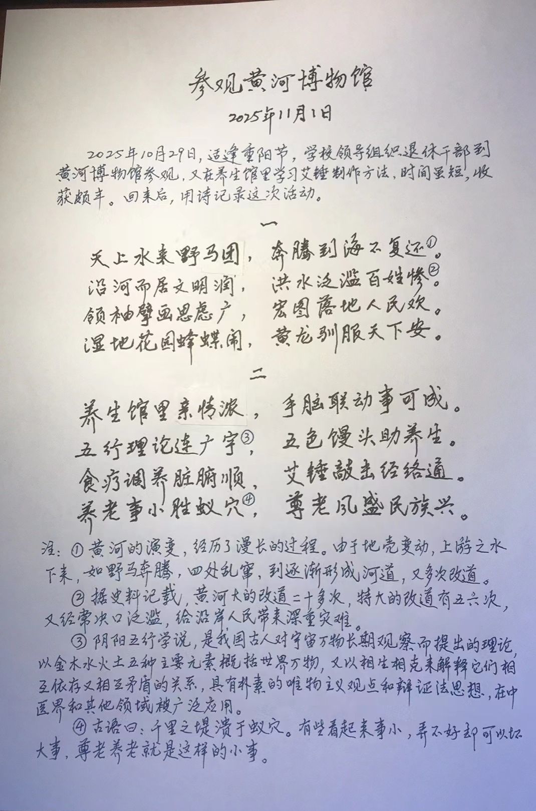 参与活动的老同志们纷纷表示,重阳节活动安排得内容丰富、温暖贴心,大家既领略了黄河文化的独特魅力,还学到了实用的养生知识,在动手实践中收获了快乐,真切感受到学校对老同志的重视与关怀,并希望学校越来越好,愿为学校发展贡献自己的余热。