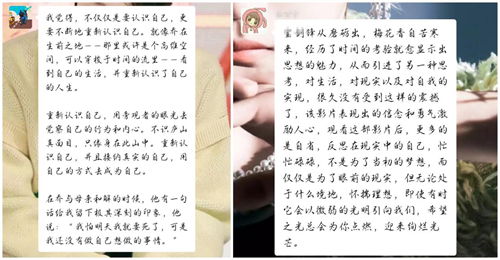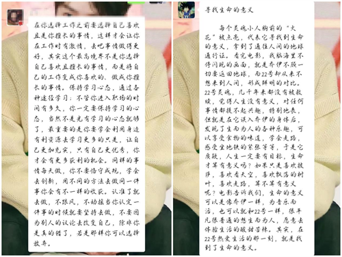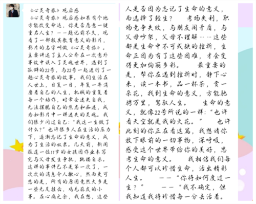之后,同学们通过网络平台分享自己对电影的赏析。纷纷发表自己的认识和感悟:每个人都可以试着像22号那样,找到自己生命的“火花”并点亮。另外,不要忘记和亲人的沟通,及时倾诉,真心沟通,得到亲人的理解和支持,是继续前进的最佳动力。