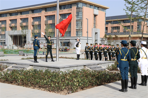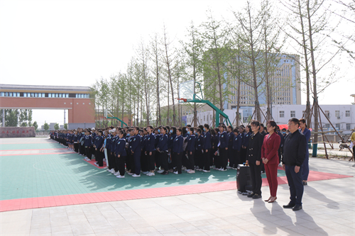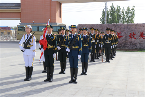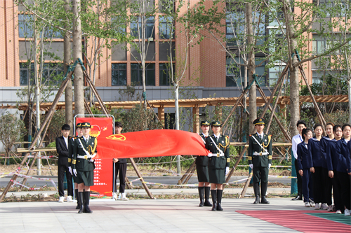 迎着五月的朝阳,国旗护卫队迈着整齐划一的步伐,在雄伟庄严的国歌声中将鲜艳的五星红旗冉冉升起。全体师生高唱国歌,行注目礼。