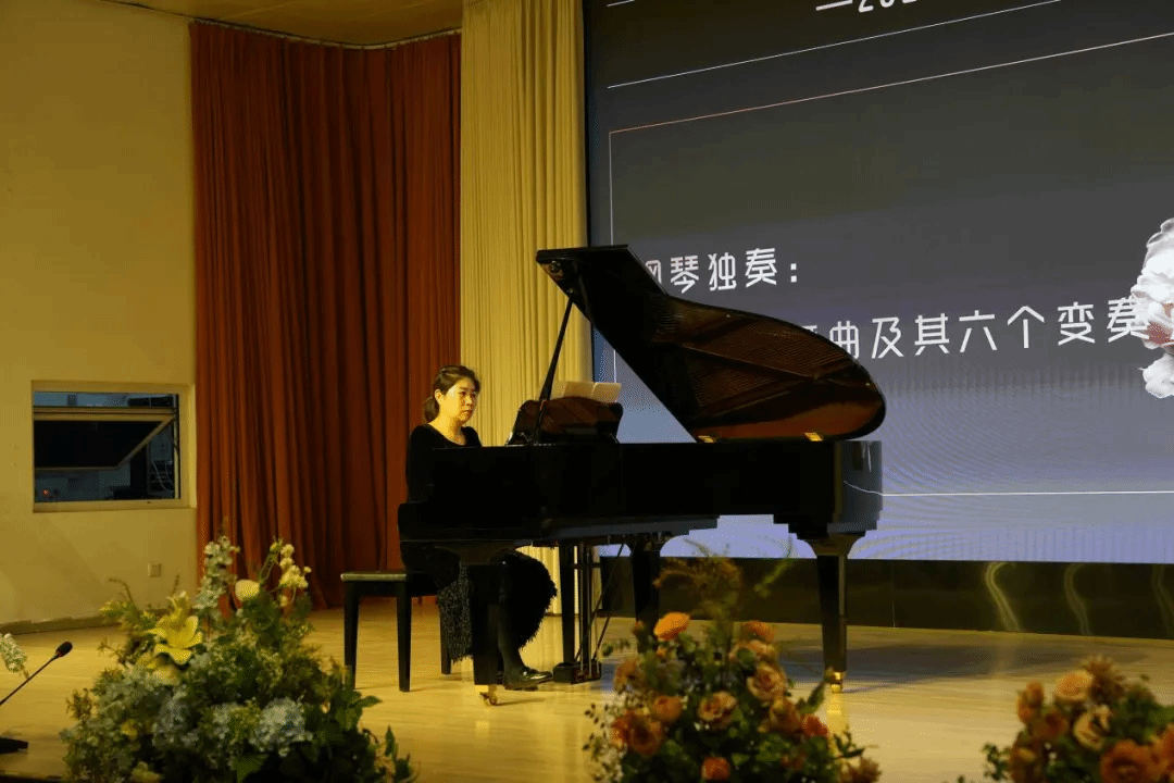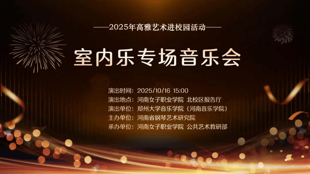 2025年10月16日下午,河南女子职业学院2025年高雅艺术进校园室内乐专场音乐会在北校区报告厅举办?;疃莩龅ノ晃V荽笱б衾盅г海ê幽弦衾盅г海?,主办单位为河南省钢琴艺术研究院,我校公共艺术教研部承办。副校长曹晖、徐红娟、周旷怡应邀出席,音乐与传媒学院全体教师以及五百余名学生现场观看。