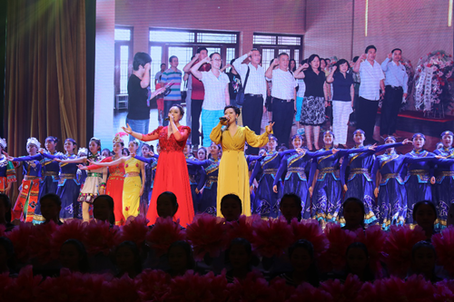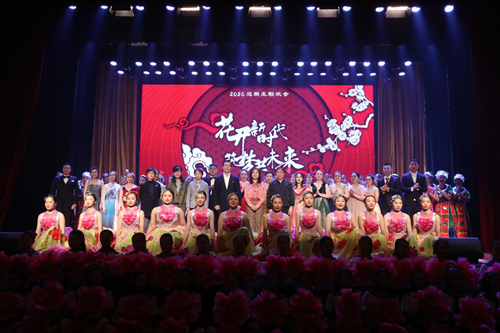晚会在歌舞《花开新时代》中落下帷幕。演出结束后,校领导登台与演出人员亲切合影留念。