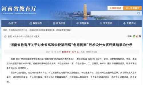 近日,河南省教育厅公布全省高等学校第四届“创意河南”艺术设计大赛结果。美术与设计学院师生在3363件/套参赛作品中脱颖而出,斩获12项荣誉,包括一等奖1项、二等奖2项、三等奖4项和优秀奖5项。这是我校注重艺术创新与实践、艺术设计教育成果的重要体现。