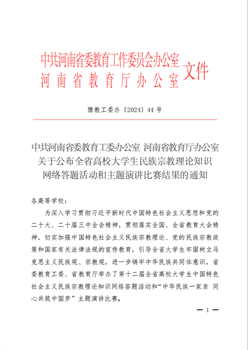 近日,由河南省委教育工委、省教育厅组织的第十二届全省高校大学生中国特色社会主义民族宗教理论知识网络答题活动结果出炉,我校现代服务与管理学院王雅雯等6名学生获省级“优秀选手奖”。