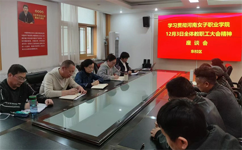 12月10日,东校区管委会、智能智造学院、校企合作遗留问题处置办公室联合召开座谈会,深入深入学习贯彻12月3日全体教职工大会精神。因工作需要未能参加全体会议的十几位同志一起听取了校党委书记李立峰,校长郭丽萍,总督学徐红娟的讲话录音。焦晖书记领学了副校长曹晖的讲话。
