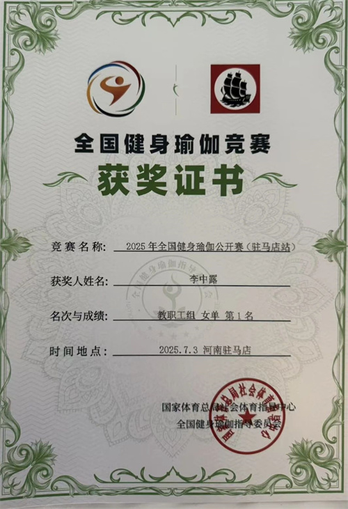 7月5日,2025年全国健身瑜伽公开赛(驻马店站)在驻马店市体育中心综合馆圆满落下帷幕,70多支来自全国各地的600多名健身瑜伽运动员进行数日的激烈角逐与技艺切磋,决出各项奖项。体育与健康学院教师李中露在比赛中取得教职工组女单冠军荣誉。