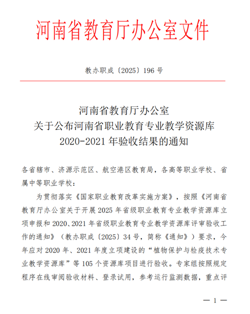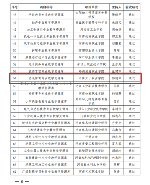 近日,河南省教育厅正式发布《河南省教育厅办公室关于公布河南省职业教育专业教学资源库2020-2021 年验收结果的通知》(教办职成〔2025〕196号),学前教育学院“幼儿保育专业教学资源库”项目顺利通过验收。该项目由校长郭丽萍主持,学前教育学院具体承建实施。