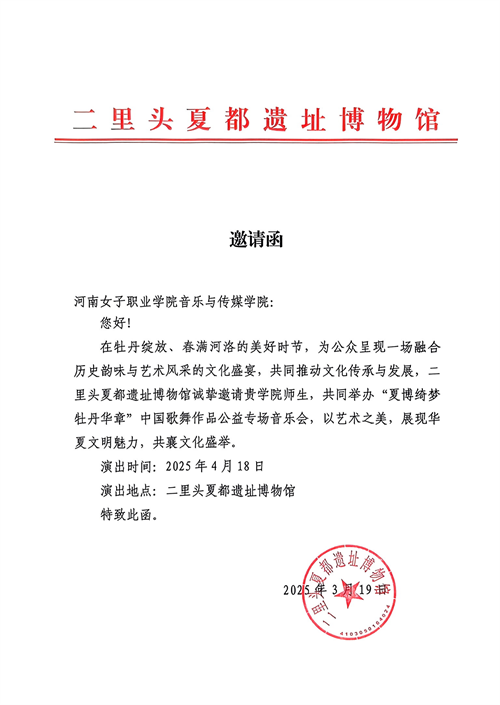 4月18日,在第42届中国洛阳牡丹文化节期间,音乐与传媒学院应洛阳二里头夏都遗址博物馆邀请,为观众献上一场以“夏博绮梦·牡丹华章”为主题的中国歌舞作品公益专场音乐会。师生们以精湛的技艺和饱满的热情,将传统与现代艺术交融,为夏都遗址的文化氛围增添了一抹绚丽的色彩。