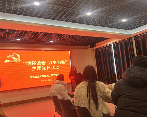 2024年12月13日是第十一个南京大屠杀死难者国家公祭日,为弘扬民族精神,增强爱国主义情怀,马克思主义学院教工第一党支部和第二党支部联合开展主题党日活动。此次活动旨在深切缅怀抗战英烈,引导党员同志们坚定信念,铭记历史,勿忘国耻,为实现中华民族伟大复兴的中国梦贡献力量。