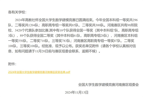 11月13日,2024年高教社杯全国大学生数学建模竞赛获奖名单揭晓。我校选派的9支参赛队伍,均在河南赛区的比赛中斩获奖项,取得了全员获奖的骄人成绩。