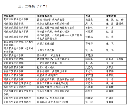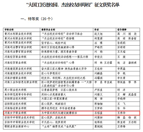 近日,河南省教育厅关工委正式公布了2024年度“大国工匠进校园、杰出校友回母校”征文活动的获奖名单。我校在此次比赛中荣获了特等奖一项、一等奖两项以及二等奖两项的佳绩。