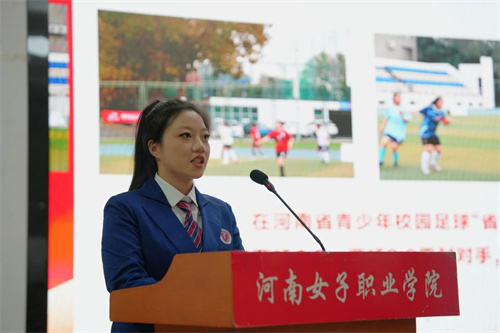 河南省青少年校园足球“省长杯”暨河南省传统特色学校比赛(大学生五人制)冠军代表李双月以《冠军之路、拼搏历程》为主题,分享了她与足球结缘的初衷、球队的成长历程、训练心得与比赛经验,并表示本次冠军不是终点,而是不断努力的新起点,我校足球队会继续在绿茵场上追逐梦想,书写辉煌。