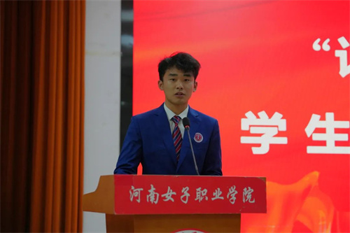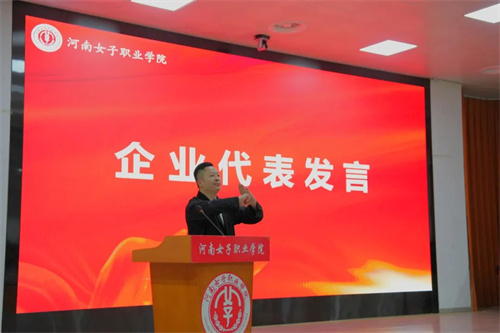 河南省潮武功夫有限公司“订制班”学生张豫翔代表发言,详细介绍了“订制班”的学习经历,认为这是一个让自己提前接触职场、了解企业文化的宝贵平台,自己一定会刻苦训练提升专业素质,并将实际所学应用到实际工作,为学校和企业创造价值。