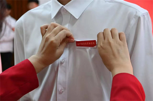 院徽是学院文化的重要组成部分,是学院精神的传承延续,是引领师生的行为准则,蕴含着学院对学子们的深切期望。与会领导为新生代表们佩戴上院徽,这一枚小小的院徽,是一种身份的确认,更是对同学们肩负责任的提醒。