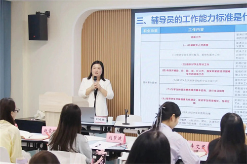 郭丽萍通过讲述亲身经历,要求全体辅导员要践行“乐教爱生、甘于奉献”的仁爱之心,从点滴做起,用一言一行影响学生,全心全意为学生成长考虑,从内心认同、珍视每一位学生的个性特征与天赋潜能,使他们都能得到最大限度的成长与发展。