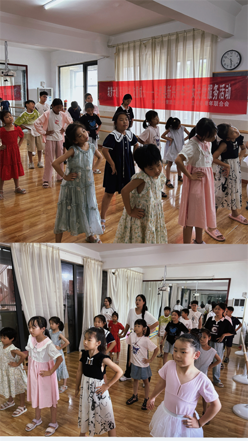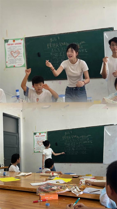 第一站,实践队来到兰考县新时代文明实践中心,以“美育教育”为主线,将所学专业与焦裕禄精神和爱国主义教育相结合,为托管班的小朋友进行舞蹈、奥尔夫、音乐和语言课程授课,舞蹈教学团队成员巧妙融入红色教育元素,提升了孩子们的舞蹈技巧。奥尔夫律动团队成员让孩子们分组协作,共同完成律动,在音乐中培训学生的合作能力。歌曲演唱团队员带领孩子们进行简谱认识,感受节奏节拍。语言教学团队成员生动讲解了《七律·长征》和《枫桥夜泊》,让孩子们感悟先辈们不畏艰难、勇往直前的品质。