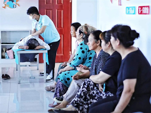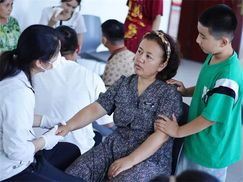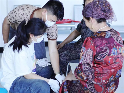 当地村民们平时因为长期的地里劳作,伴有各种常见病。推拿按摩作为一种安全有效的中医疗法,可以舒暖肌肉酸痛,促进血液循环。体育学院教师陈明明及体育学院学生马晓璐、朱家宝、刘悦阳、韩頔,根据每一位前来患者的身体状况进行针对性推拿按摩。运用拿、揉、按、提等按摩手法极大程度缓解了乡亲们的肌肉酸痛症状。短短的一周时间内,共治疗患者 128 人次。来不及擦掉的汗珠,长时间佩戴手套而泛白的双手,细致耐心的答疑解惑,无不体现了我校师生认真负责的工作态度,前来治疗的患者多次向我校师生表达感谢。