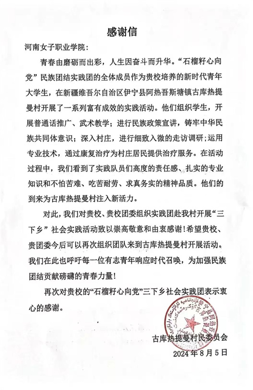 为深入学习贯彻习近平新时代中国特色社会主义思想和党的二十大及二十届二中、三中全会精神,学习贯彻习近平总书记关于民族团结进步的重要论断和部署,铸牢中华民族共同体意识,7月28日至8 月4日,我校“石榴籽心向党”团队奔赴新疆伊宁县古库热提曼村开展“三下乡”社会实践活动。实践团精心筹备、认真规划,组织开展推普课堂、武术教学、健康指导志愿服务、民族团结主题宣讲、参观博物馆、走访调研等一系列实践活动。