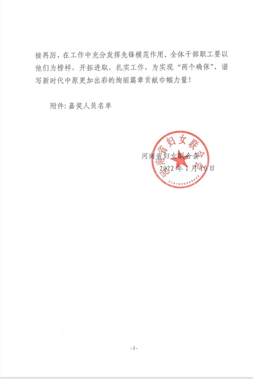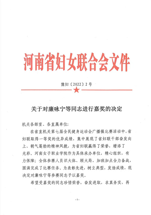 河南省妇女联合会印发了豫妇〔2022〕2号《关于对廉咏宁等同志进行嘉奖的决定》,决定中对我校在承办广播操比赛期间精心组织、高度重视做出表扬,对广播操代表队在省直机关第七届全民健身运动会广播操比赛活动中荣获一等奖的优异成绩、突出表现予以嘉奖。