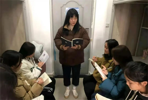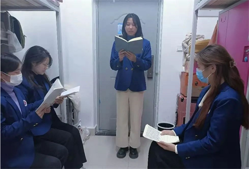 班长张玉阳正在绘声绘色的给宿舍成员们传达她学习到的党的十九届六中全会精神,舍友们听得聚精会神。