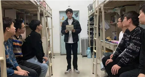 “党的十九届六中全会,重点研究和全面总结了党的百年奋斗重大成就和历史经验等问题,我们大家作为青年团员·······”。吕洋同学正在宿舍内开展党的十九届六中全会精神宣讲活动,带领宿舍成员原原本本学习全会文件,读原文、悟原理,深刻领会要点要义。