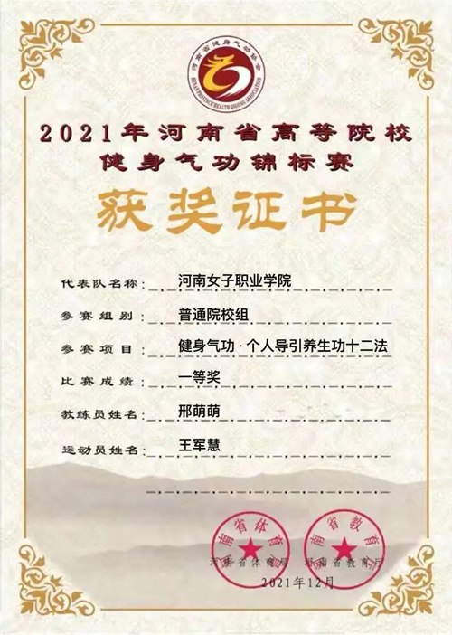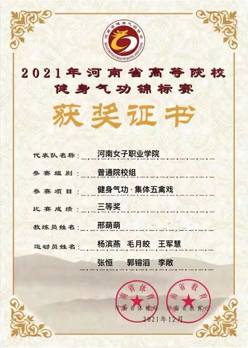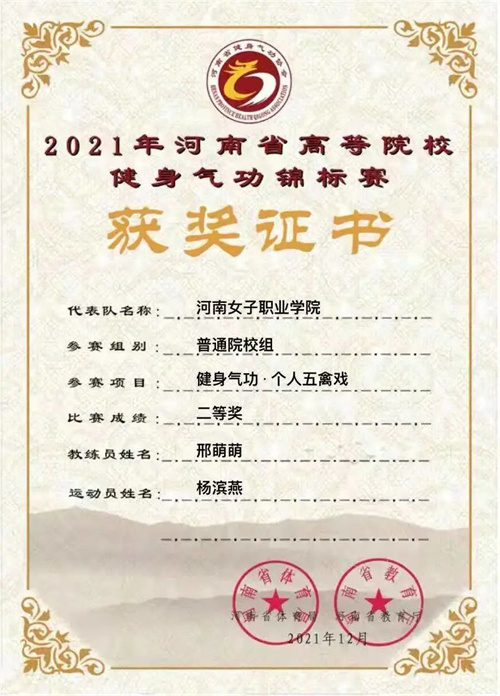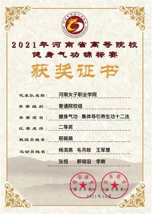 11月28日,我校武术队在河南省高等院校健身气功锦标赛中,参赛的四个项目全部获奖。其中在个人项目中,王军慧同学荣获“导引养生功十二法”一等奖,杨滨燕同学荣获“五禽戏”二等奖。在集体项目中,李敞、张恒等6位同学分别荣获“导引养生功十二法”二等奖,“五禽戏”三等奖。