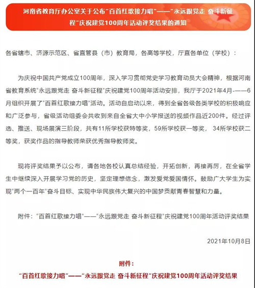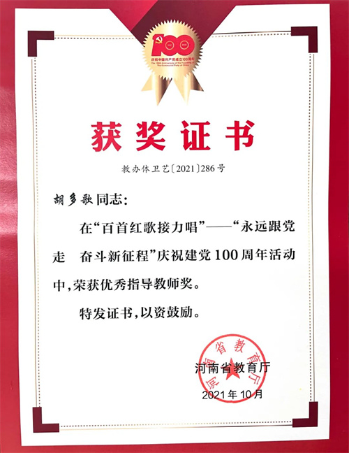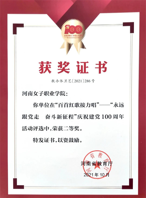 近日,河南女子职业学院喜获河南省教育厅“百首红歌接力唱”——“永远跟党走,奋斗新征程”活动二等奖,胡多歌获优秀指导教师奖。