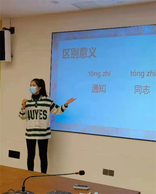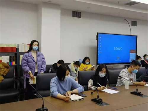 研讨期间,语言组教师代表郑梦凡和历史组教师代表任培培依次进行了微课展示。郑梦凡进行了《普通话训练—声调》微课展示,她以赵元任的《施氏食狮史》绕口令导入,着重讲解了声调的区别、声调的调类及声调的调值。任培培以世界史轴心时代引入微课《千古圣人—孔子》,在介绍孔子生平的基础上,借“马棚失火”、“人殉之礼”等故事阐述了孔子的核心思想——仁爱,并简要分析了孔子的政治思想和教育思想。