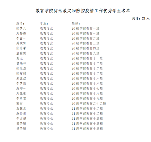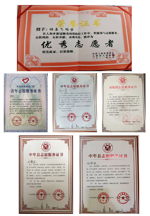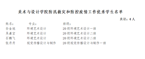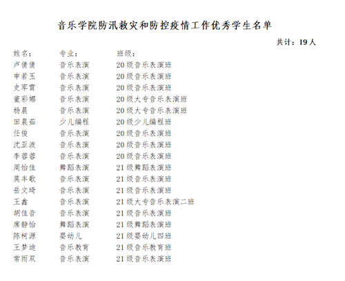 经各学院分团委推荐,校团委评选后为音乐学院、管理学院、美术与设计学院、教育学院共计52人,授予疫情防控和防汛救灾工作先进个人的荣誉称号。
