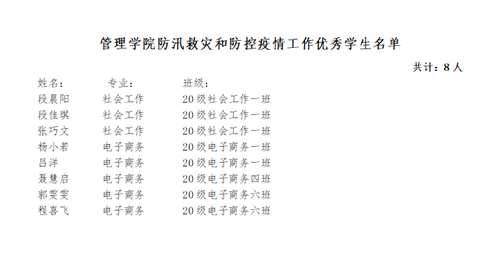 希望受表彰的个人珍惜荣誉,戒骄戒躁,奋发向上,再接再厉。希望全校同学以他们先进事例为榜样, 自觉践行社会主义核心价值观,大力弘扬伟大防汛抗疫精神,不怕苦、不畏难、不惧牺牲、甘于奉献,展现青春激昂的风采,为努力培养担当民族复兴大任的时代新人、培养德智体美劳全面发展的社会主义建设者和接班人不懈努力。