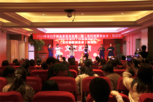 10月16日下午,圆方党建学院三楼会议室笑声与掌声不断,河南女子职业学院(河南省妇女干部学校)2021年农村创新创业者培训班文艺汇演正在火热进行。