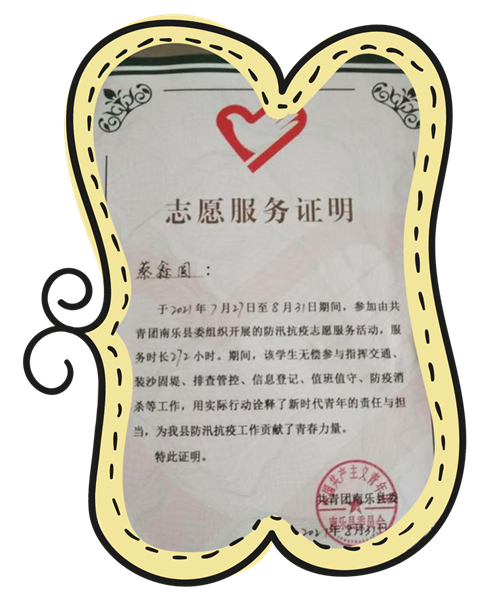7月27日至8月31日,蔡鑫圆一直在濮阳市南乐县蔡紫金村进行防汛抗疫志愿服务活动。此期间蔡鑫圆参与指挥交通、装沙固堤、排查管控、信息登记、值班值守、防疫消杀等工作,没有怨言,只有埋头苦干。