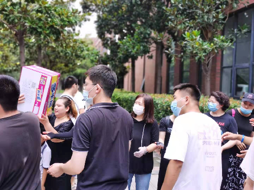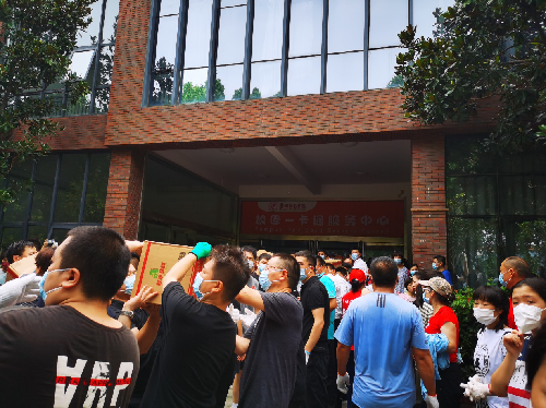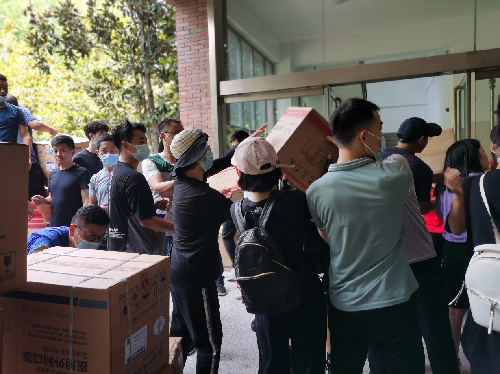 当天上午9时,音乐学院院长胡多歌,副院长王娜,音乐学院教师原洁、郗丹,张慧、于真,她们从郑州市的四面八方聚集到英才街郑州师范学院东门,同其他志愿者一起搬卸广西人民捐献约100多吨的物资。在场的志愿者有序的进行搬卸,个个汗流浃背却没有人喊累。人多力量大,一个上午就已经搬运了50多吨救灾物资。大家稍作休息后,又马不停蹄地投入到发往新乡灾区物资的搬运中。