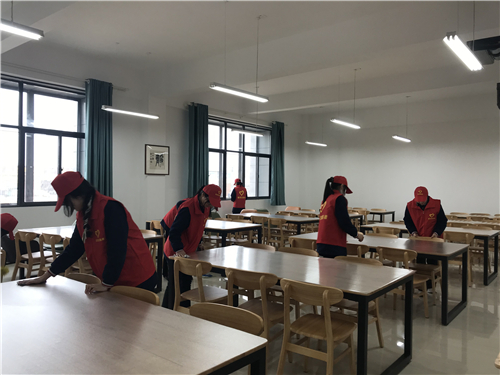 50名团员志愿者精神抖擞、分工明确、组织有序。她们为大树浇水,打扫图书馆、教师办公室等场所,虽然辛苦,但每个人的脸上都洋溢着幸福的笑容。