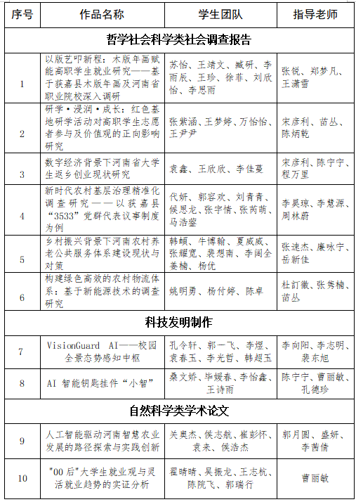 根据《关于举办第十七届“挑战杯”河南省大学生课外学术科技作品竞赛省赛复赛的预通知》文件精神,校团委进行动员部署,经学院申报、校级评审等环节,共评选出10件作品参加省级复赛,现将拟推荐参赛项目公示如下: