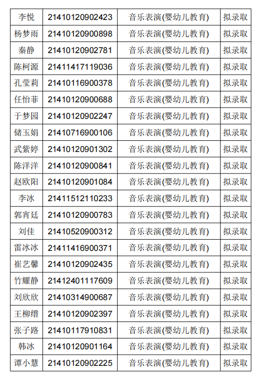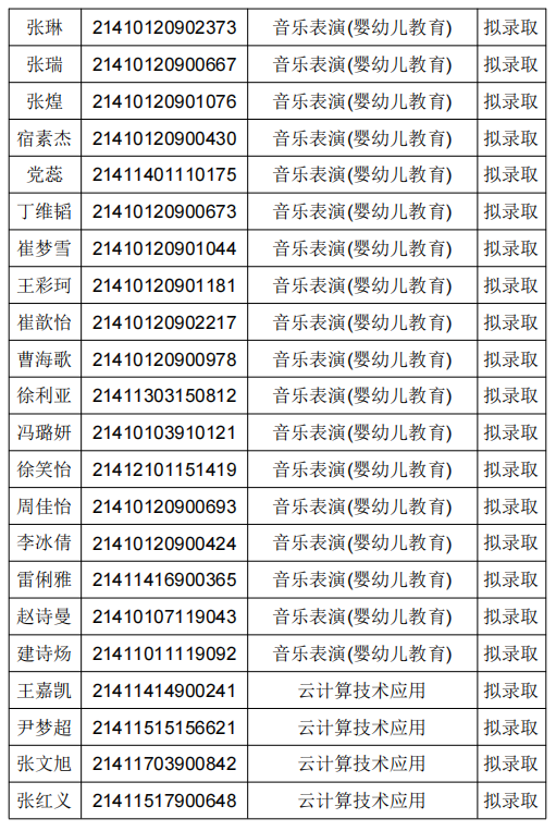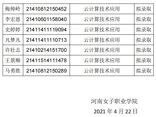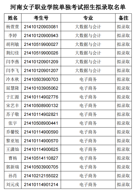 根据《2021年河南女子职业学院单独考试招生章程》录取规则,经学院高职单独考试工作领导小组研究决定,现将我院2021年高职单独考试招生拟录取名单进行公示: