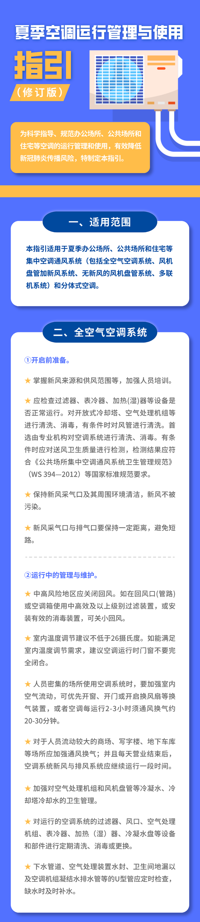 为科学指导、规范办公场所、公共场所和住宅等空调的运行管理和使用,有效降低新冠肺炎传播风险,国家卫健委制定了《夏季空调运行管理与使用指引》。现将《指引》转发,请大家认真学习,安全、卫生、正确地使用空调。