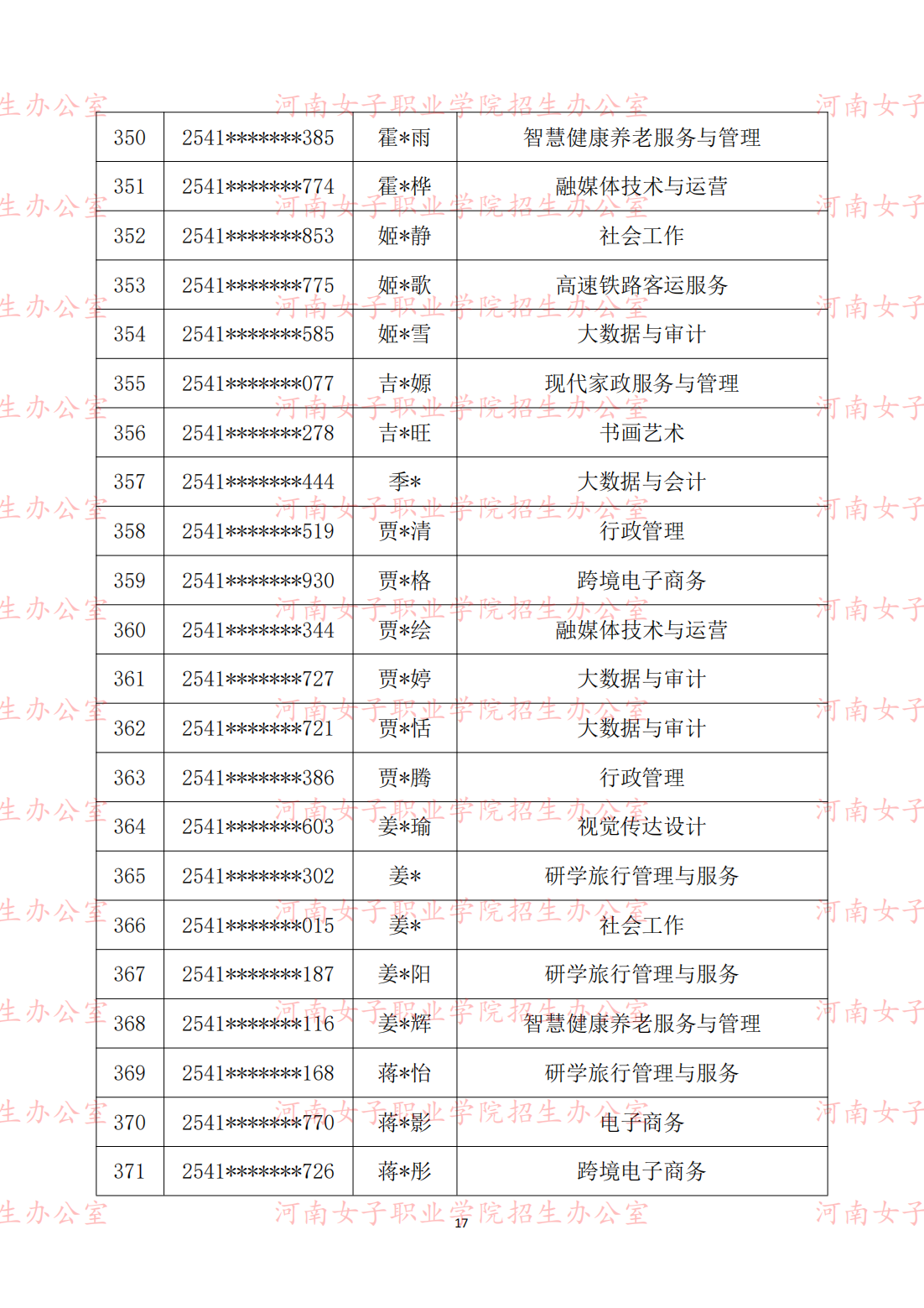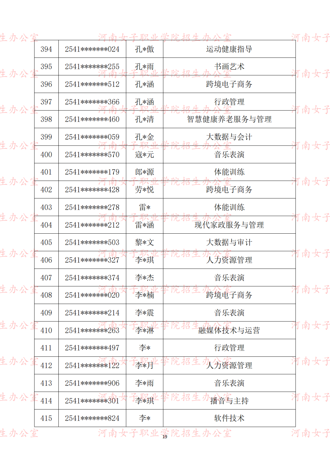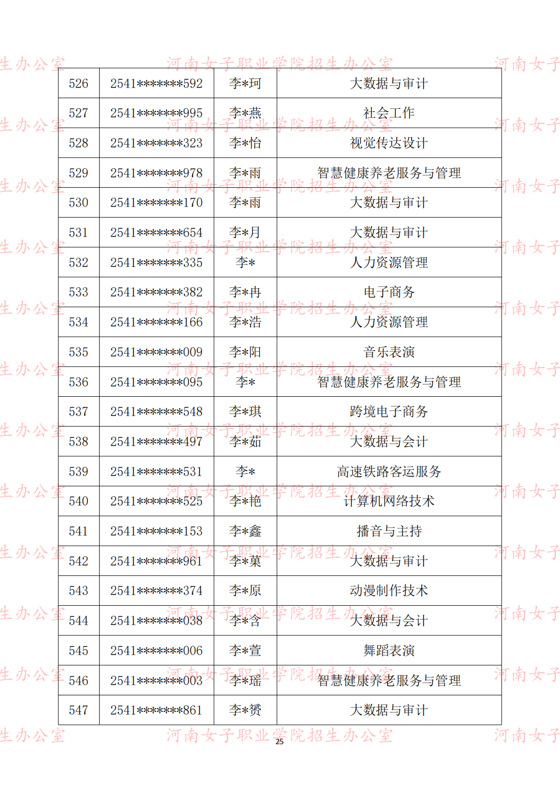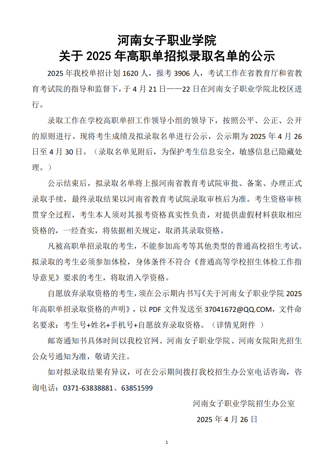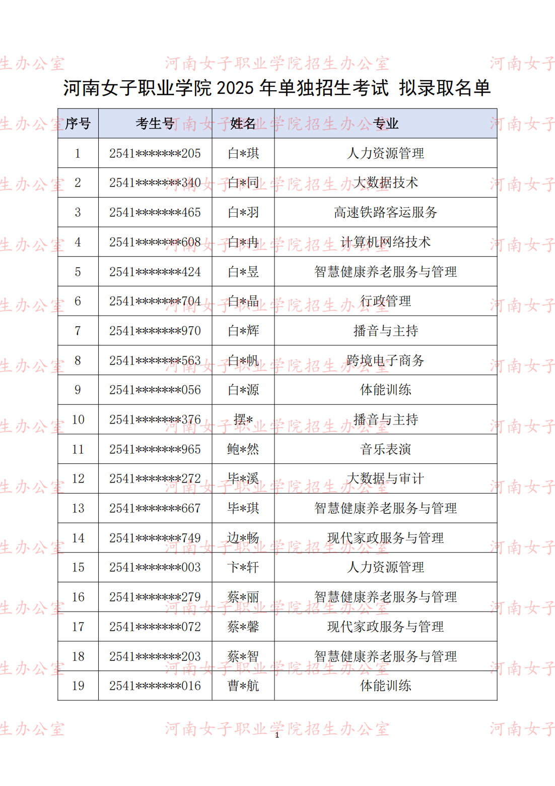 河南女子职业学院关于2025年高职单招拟录取名单的公示
