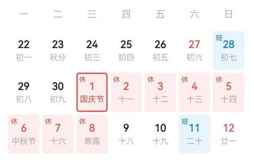 10月1日至8日放假调休,共8天。9月28日(星期日)、10月11日(星期六)上班,9月28日24级学生补星期三课程,10月9日正式上课,10月11日补星期四课程。
