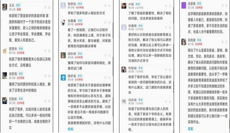 开设成效开设课程以来,我们通过对已进行的家庭教育课程实施情况的反馈和调查,发现学生对家庭教育的重要性有了新的认识。成家模块,使学生对婚恋观有了新的认识,对于家庭的建立有了更全面深刻的思考,对女大学生关于婚恋的困惑有重要的启发,对男大学生的婚恋态度和婚恋责任心也有积极的促进。爱家模块,我们由苏武牧羊的豫剧片段导入,厚植家国情怀,提升了大学生爱与被爱的能力,加深了对家的理解和感情。和家模块,是最受欢迎的模块,增进了学生对亲密关系、亲子关系、隔代关系的认知,其中家庭沟通、家庭关系、情绪管理的具体方法和技术,直接帮助学生在一定程度上改善了与父母的沟通方式,化解了部分家庭矛盾,增进了亲子关系,减少了因家庭问题而进行心理咨询的数量和频率。齐家和美家模块的测评还未实施到。我们设想在齐家模块,通过弘扬中华优秀家庭文化,尤其是深度挖掘河南本土的家庭教育故事,传承好家风、好家训、好家教。美家模块,我们拟侧重实践,注重与劳动教育、思政实践课的结合,依托我们美术学院,设计美家实践教育项目,通过美家的具体能力培养,如家庭环境设计、家务能力培养等,通过劳动的形式,让学生深切体验家庭之美好。学生反馈如下图: