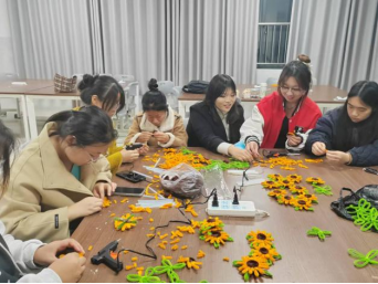 活动现场,社团学生们用一根根扭扭棒缠绕成色彩斑斓的向阳花,每一朵向阳花的背后,都伴随一段温暖的寄语,视频中的每一句祝福也满怀鼓励与期望。