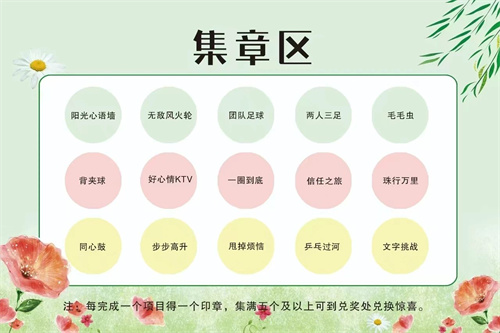 本次游园会采用“玩游戏、集印章、换奖品”的形式,既有如毛毛虫、无敌风火轮、珠行万里等趣味运动合作项目,也有甩掉烦恼、文字挑战等文字类项目,共15项。