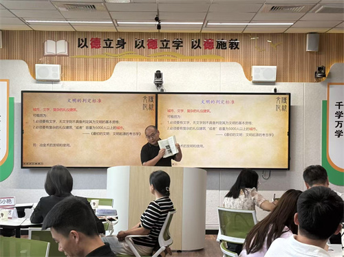 而后,教工第一党支部章宗文、李鹏两位教师代表进行专题讲座。章宗文围绕《中华优秀传统文化》中的“城居文化”主题展开讲解。从夏代城市遗址的考古发现,到周代都城规划,再到洛阳城三次营建的历史脉络,以及河南四大古都的文化底蕴,章老师旁征博引、层层递进,以丰富的历史资料和严谨的学术逻辑,生动展现了中华城居文化的深厚渊源。在分享《光从中华来》《言不必称希腊》两本著作时,他结合具体案例,有理有据地驳斥了“中国文明西来说”的错误观点,彰显了坚定的文化自信。在“说文解字”环节,章老师通过对甲骨文字“邑”等的深入解读,带领在场教师探寻汉字背后的文化密码,引发热烈讨论。