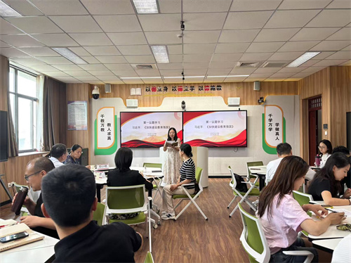 6月13日上午,获嘉县委党校党支部书记崔会然一行来到河南女子职业学院马克思主义学院,与马克思主义学院教工第一党支部开展“支部联建聚合力,理论联学凝共识”主题党日活动。活动第一项全体党员进行第一议题学习,由张艺领学“重温习近平总书记2024年9月9日在全国教育大会上的讲话——《加快建设教育强国》”。