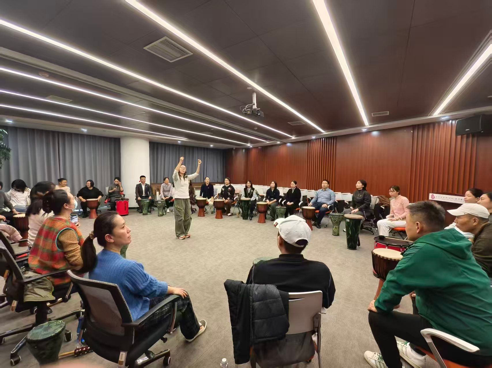 区别于传统座谈会形式,本次活动创新性地将艺术疗愈理念融入党建实践。音乐与传媒学院党总支书记王娜介绍:“鼓圈疗法通过节奏共振激活大脑神经,能有效缓解压力。我们希望用这种'非语言沟通'的方式,让党员们在沉浸式体验中实现情感联结。”
