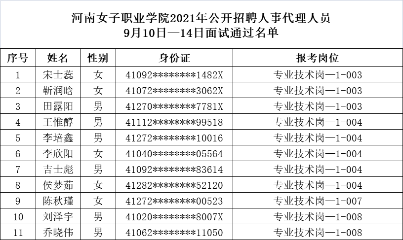 河南女子职业学院2021年公开招聘人事代理人员9月10日—14日面试通过人员公示
